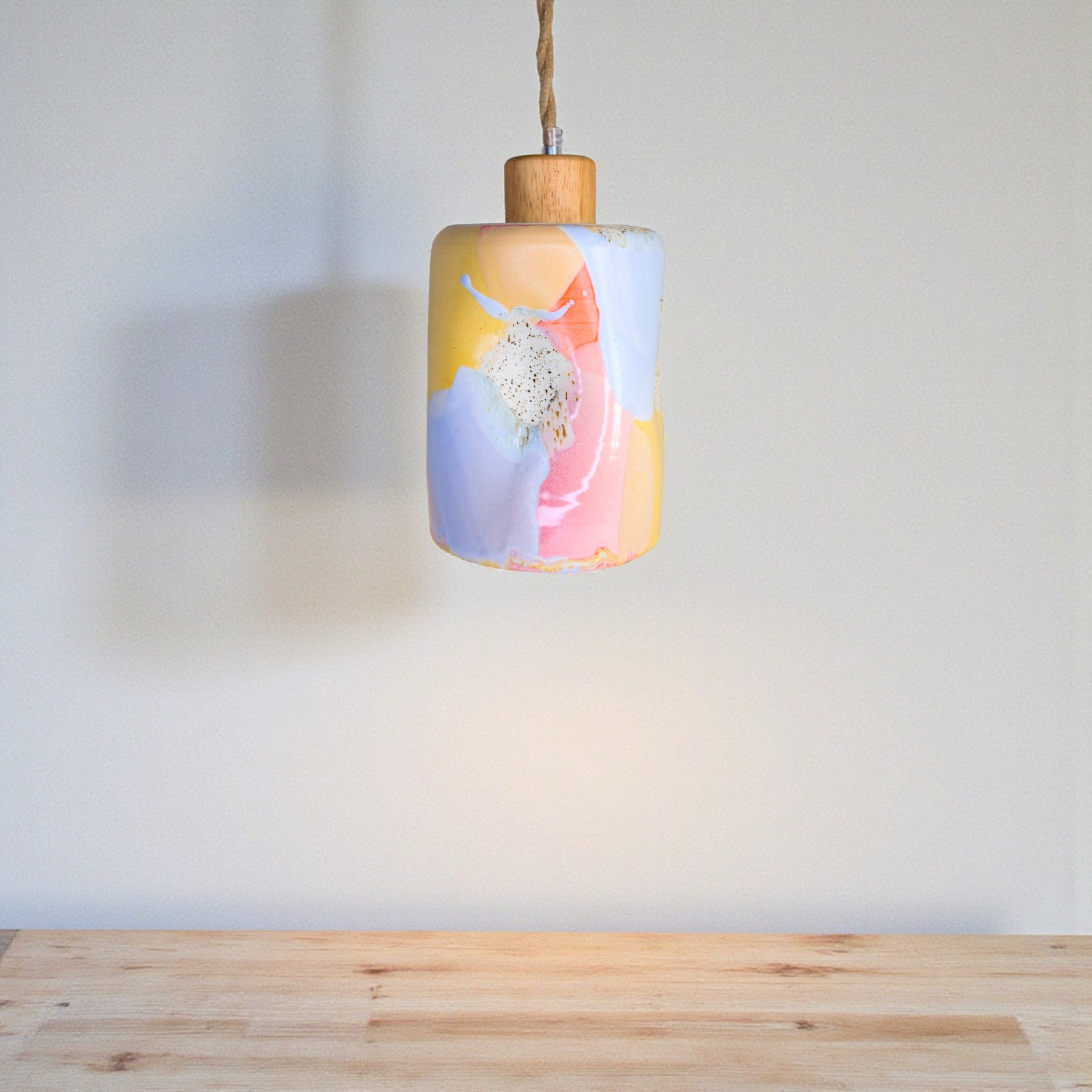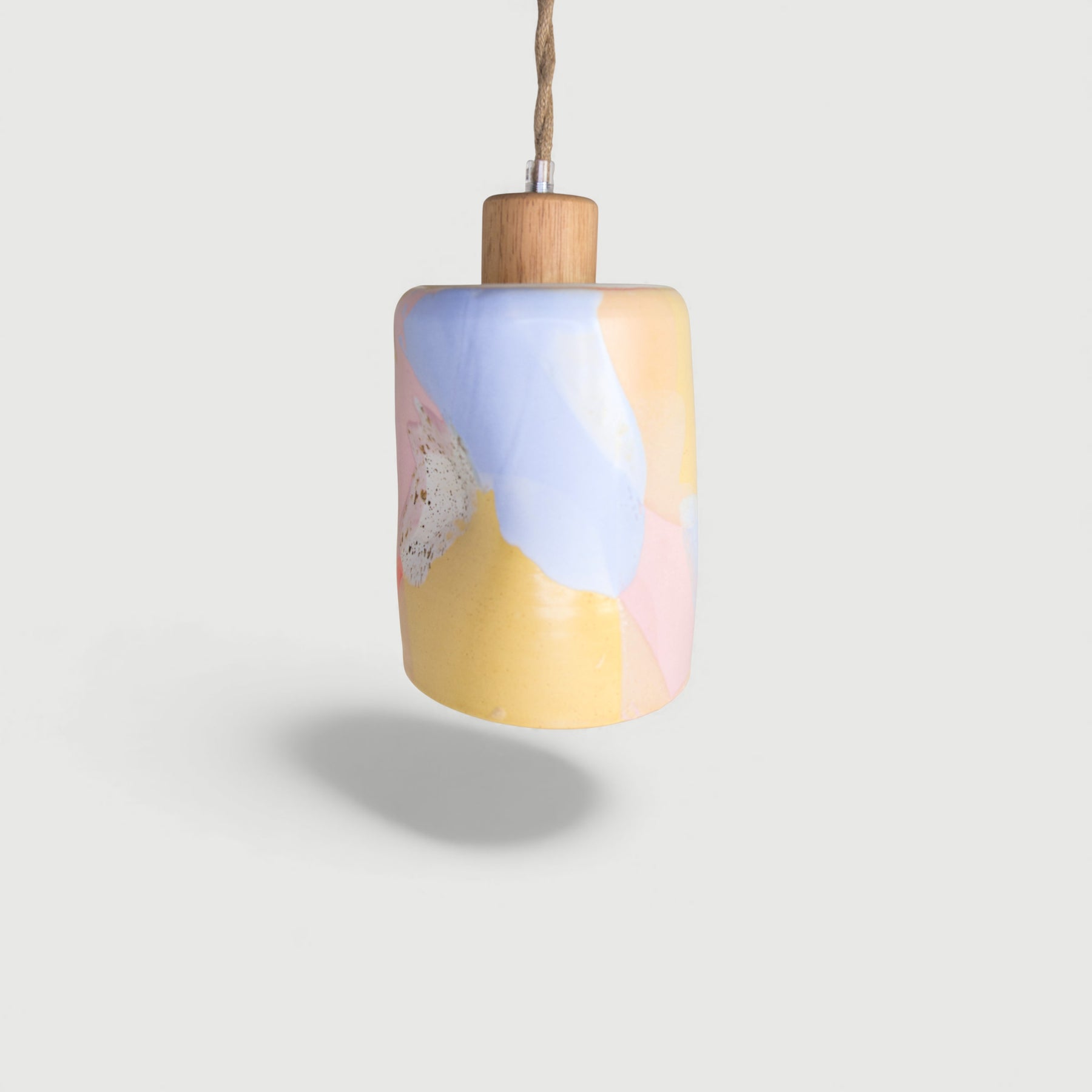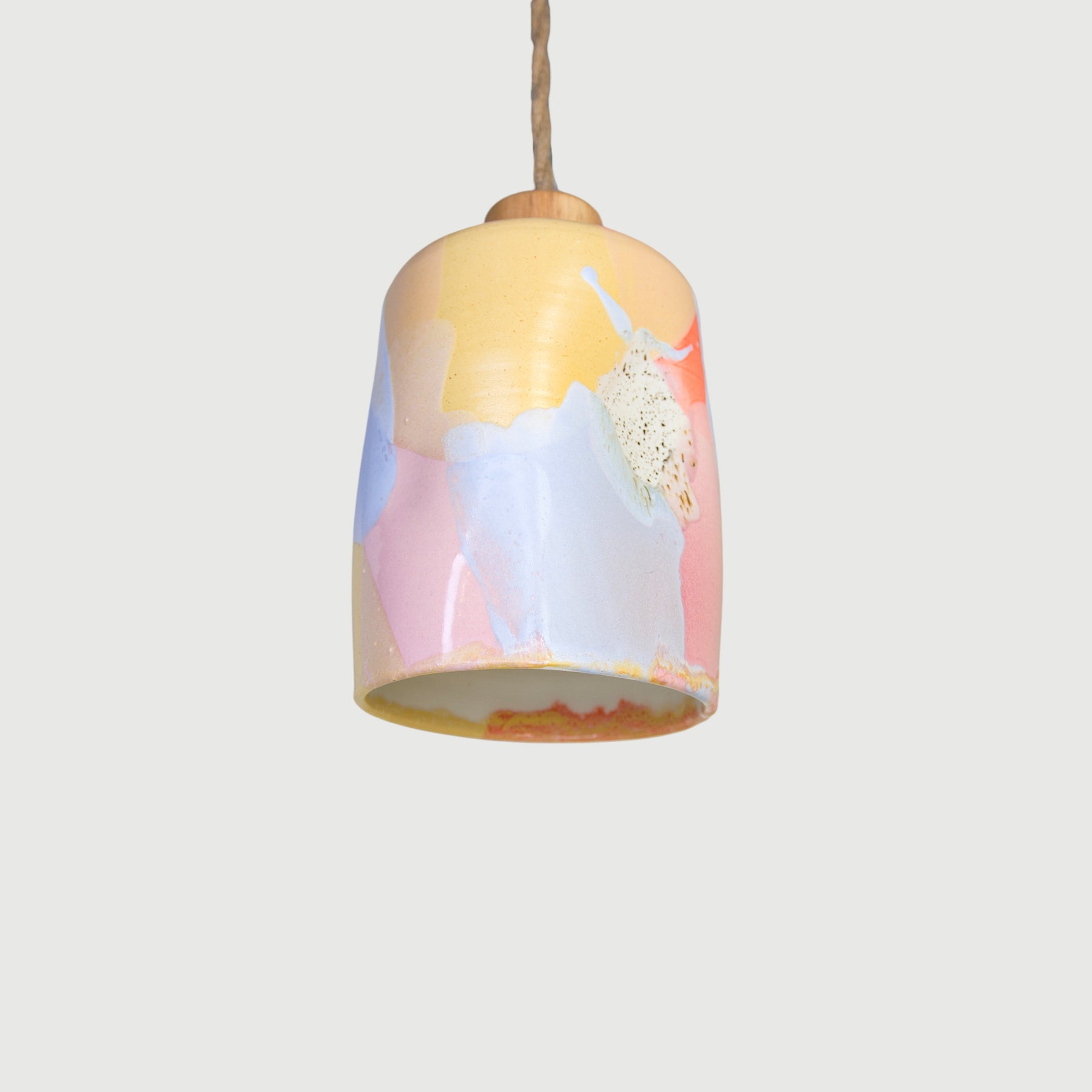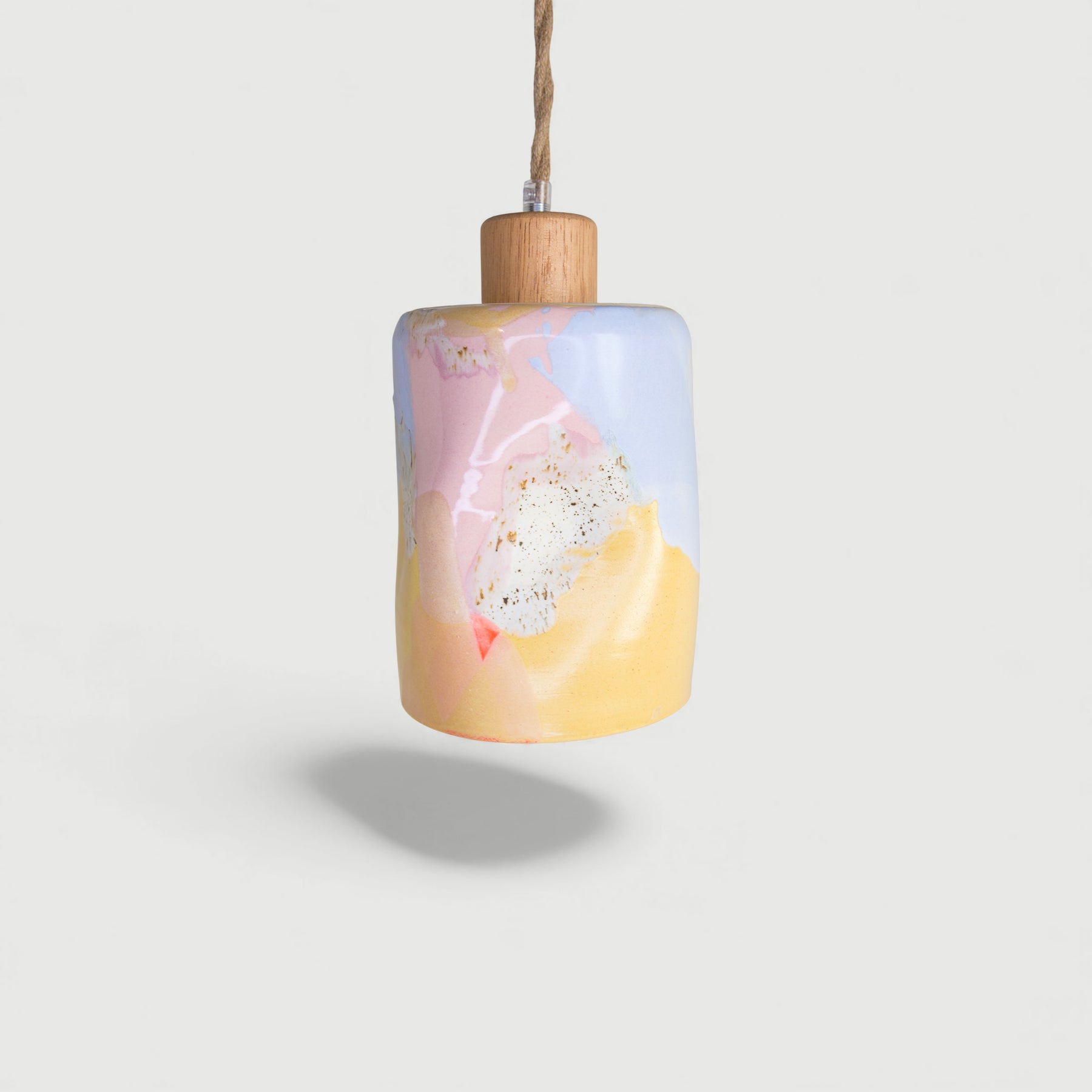 A one-of-a-kind ceramic light fixture, handcrafted from white clay. Its minimalist, colorful design celebrates the beauty of imperfection with a deliberately bumpy texture. Its vibrant, optimistic colors are each developed using specific minerals that form exceptional glazes.