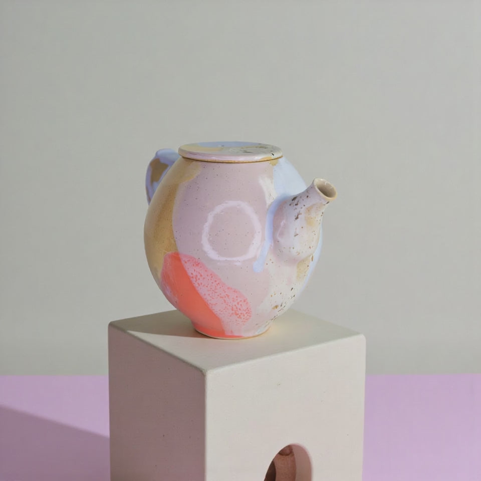 Savourez votre thé avec optimisme grâce à cette théière japonaise artisanale émaillée de style Cléo, un mélange de couleurs pastel. Fabriquée à la main en argile blanche et glacée avec soin, chaque pièce est unique.